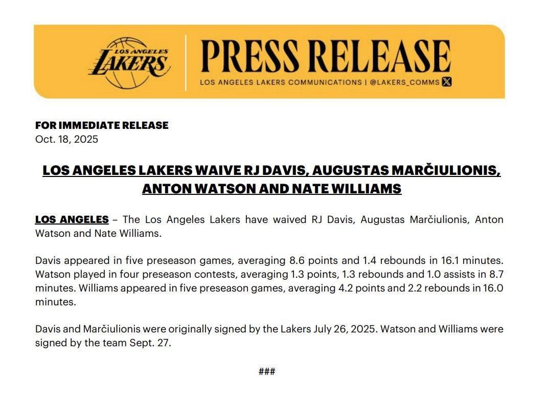 北京时间10月19日,湖人官方发布公告,宣布裁掉RJ-戴维斯、安东-沃特森等4人。 湖人官方表示:球队裁掉RJ-戴维斯、奥古斯塔斯-马修利奥尼斯、安东-沃特森和内特-威廉姆斯(杰纳森-威廉姆斯)。 RJ-戴维斯代表湖人出战5场季前赛,场均登场16.1分钟得到8.6分1.4篮板。 安东-沃特森代表湖人出战4场季前赛,场均登场8.7分钟得到1.3分1.3篮板1助攻。 威廉姆斯代表湖人出战5场季前赛,场均登场16分钟得到4.2分2.2篮板。