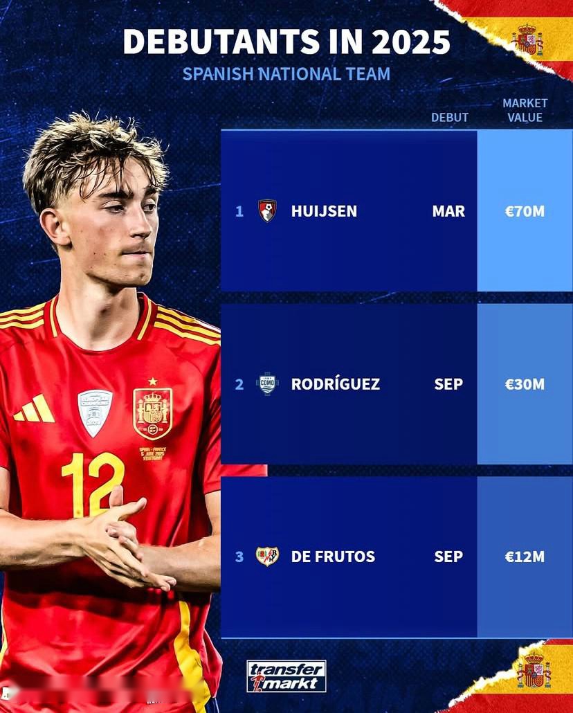 北京时间10月16日,德转列出了2025年完成西班牙国家队首秀的球员,今年到目前为止德拉富恩特仅给了三名球员完成国家队首秀的机会,今夏转会皇家马德里的赫伊森领衔。