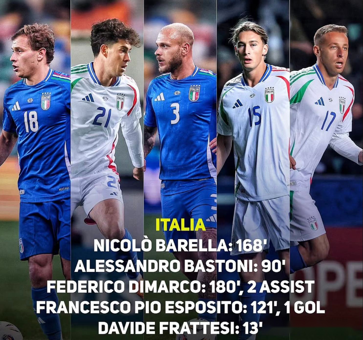 具体来说,意甲五强有13名球员,打满了这波FIFA比赛期的180分钟比赛,国米有3人:迪马尔科、邓弗里斯和阿坎吉。
