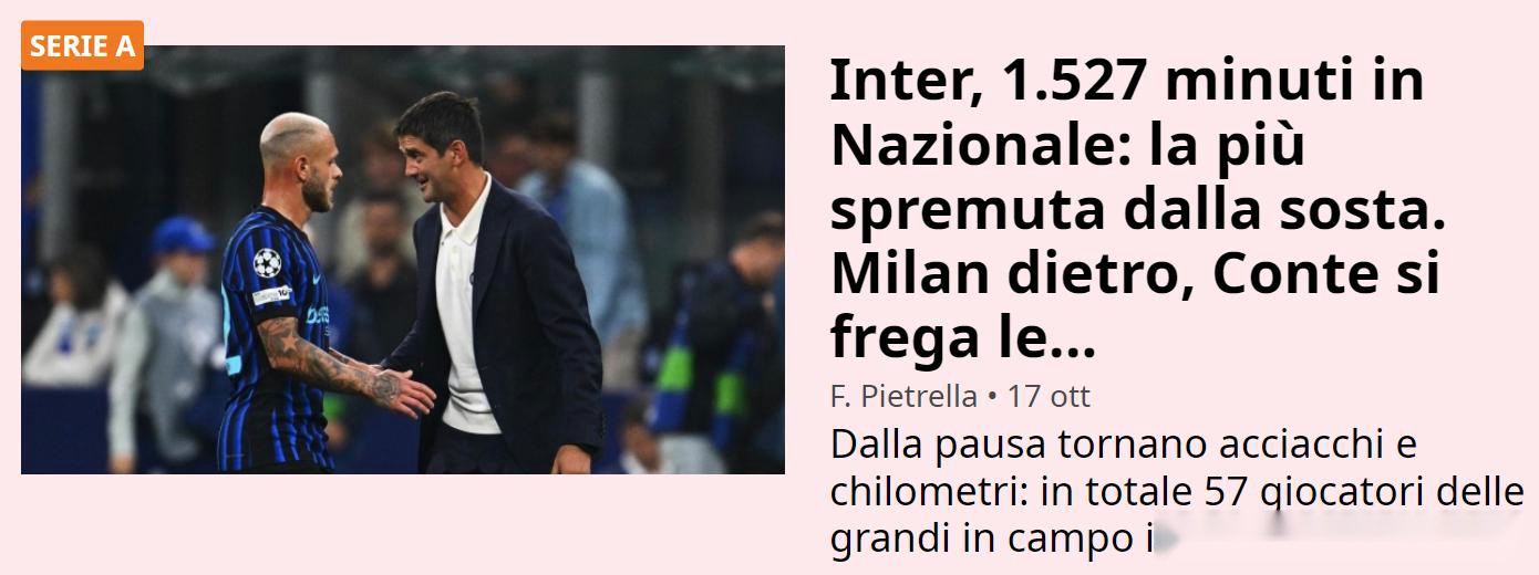 但这次国家队比赛日后,意媒盘点“FIFA病毒”对意甲争冠五强的影响时指出:五强都受到影响,其中,米兰双雄代价最为惨痛,这会让两队都在接下来几周遭遇考验 。