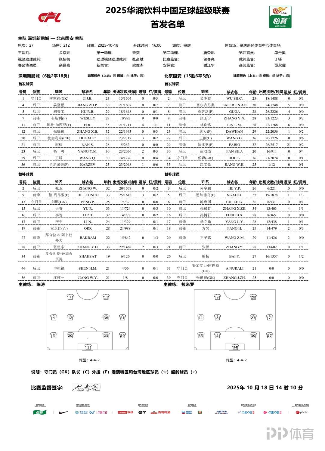 北京时间10月18日16:00,中超第27轮继续进行,北京国安作客肇庆新区体育中心体育场挑战深圳新鹏城,本场主裁判为金京元,VAR裁判为张杨帆,赛前双方首发出炉。
