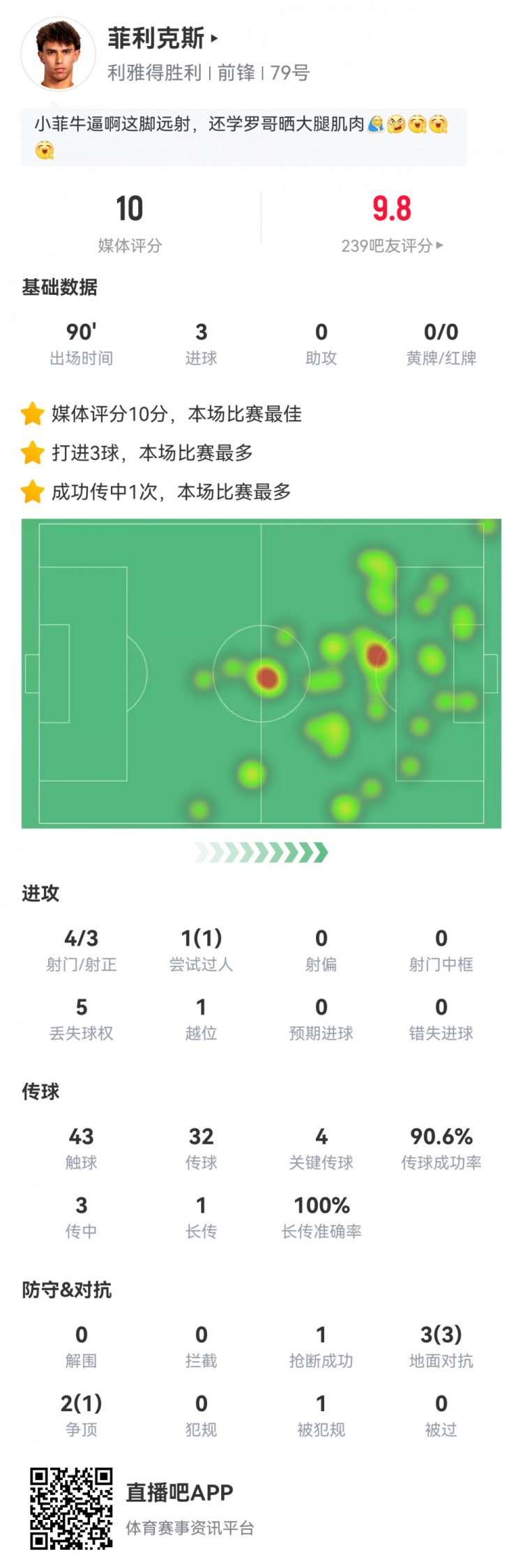 直播吧10月19日讯 本轮沙特联,利雅得胜利5-1哈萨征服。此役菲利克斯首发打满全场,球员全场重点数据如下↓4射3正3粒进球1次过人1成功5次丢失球权1次越位43次触球传球成功率90.6%4次关键传球5次对抗成功4次1次被犯规评分10
