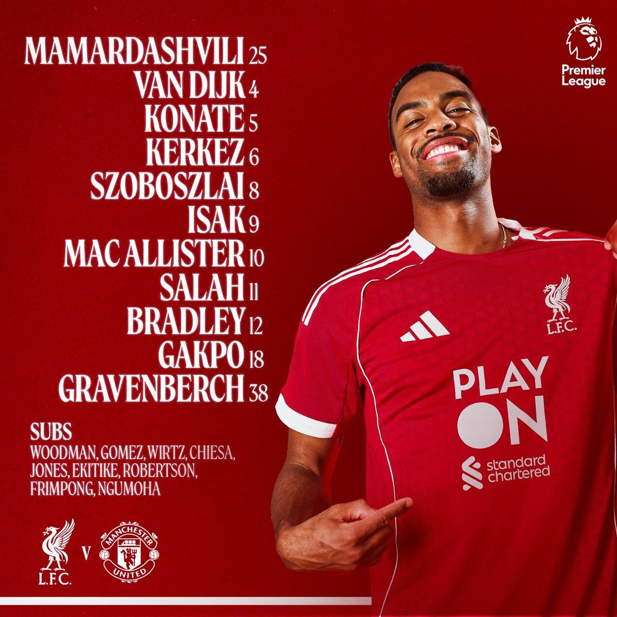 利物浦首发: 25-马马尔达什维利、12-康纳-布拉德利、5-科纳特、4-范戴克、6-凯尔凯兹、38-赫拉芬贝赫、10-麦卡利斯特、8-索博斯洛伊、11-萨拉赫、18-加克波、9-伊萨克